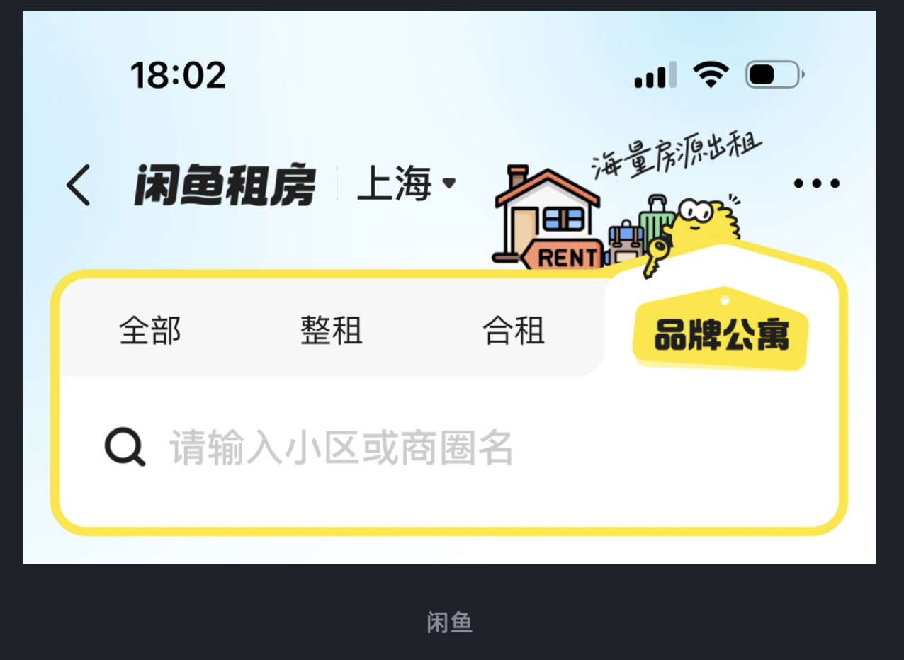 傳統(tǒng)租房板塊多以 “文字 + 普通卡片” 呈現(xiàn),用戶需先讀文字才能識(shí)別功能;閑魚則直接將 “房屋結(jié)構(gòu)” 轉(zhuǎn)化為視覺符號(hào) —— 卡片上用簡(jiǎn)化的房屋輪廓圖標(biāo)替代傳統(tǒng)標(biāo)簽,配合 “RENT” 英文標(biāo)識(shí),讓用戶一眼就能關(guān)聯(lián) “租房” 業(yè)務(wù)。這種設(shè)計(jì)不僅強(qiáng)化了業(yè)務(wù)屬性,還通過圖形化降低了信息識(shí)別成本,同時(shí)獨(dú)特的視覺符號(hào)也加深了用戶對(duì)產(chǎn)品的記憶度。