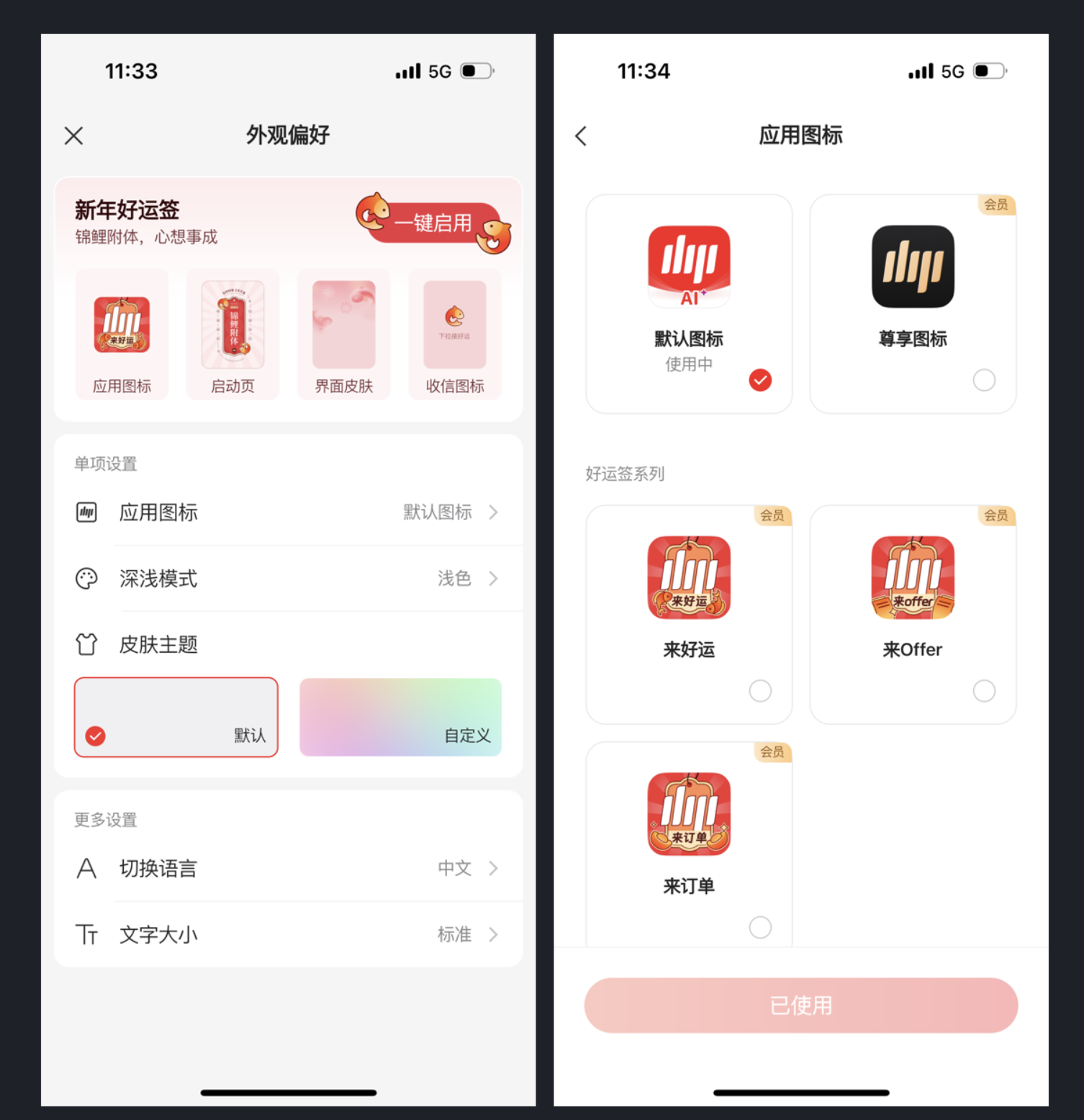 更貼心的是,這些設置都支持 “單項調整”—— 比如用戶只想換圖標,不用連帶改皮膚;想調文字大小,也不用重新設置模式。這種 “精細化自定義”,讓用戶感覺 “這個 APP 是為我量身定制的”,不僅降低了審美抵觸,還悄悄提升了用戶對產品的好感度。