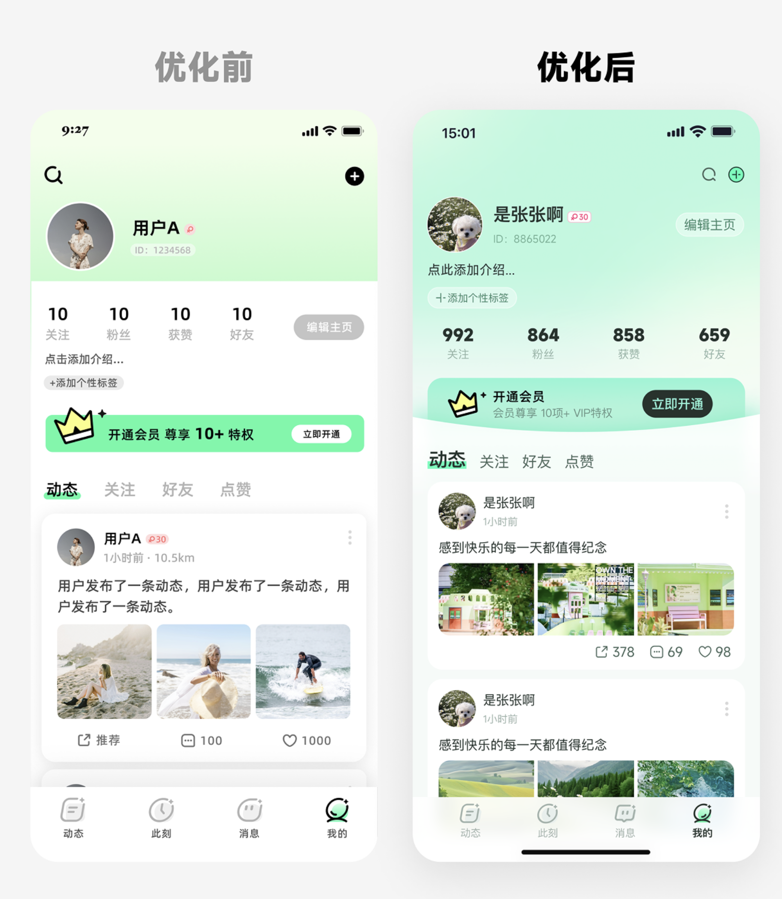 2. 輕分割:用淺灰色背景分割不同的動態(tài)卡片,替代之前厚重的投影 —— 既區(qū)分了模塊,又不會讓頁面顯得 “笨重”;