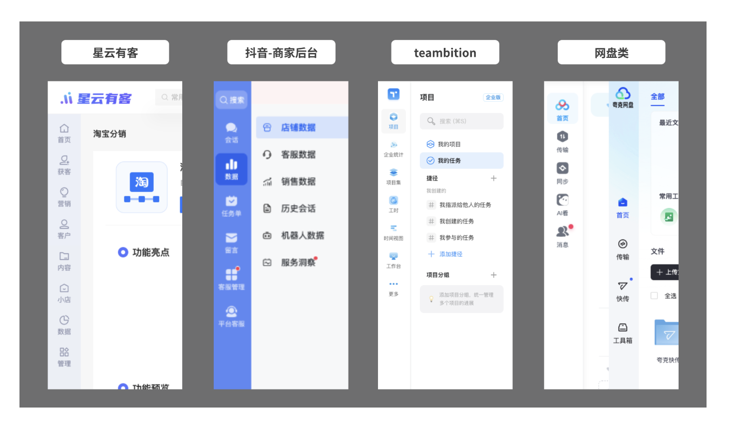 - 細欄(垂直導航):以圖標為核心,文字輔助說明,適用于模塊較少、需最大化展示內容區(qū)域的場景,如網(wǎng)盤類產(chǎn)品、輕量型工具后臺。優(yōu)勢是簡潔高效,能減少導航對核心工作區(qū)的占用,但要求用戶對圖標含義有較高認知度,典型案例包括夸克網(wǎng)盤、Teambition 企業(yè)版。