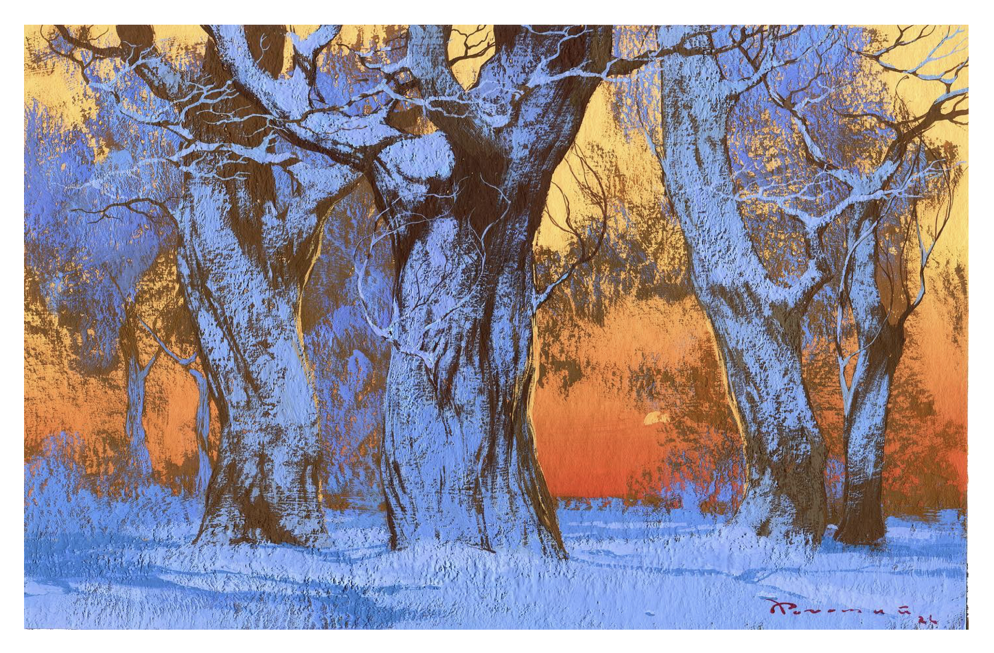 提起冬日,人們常聯想到蕭瑟與沉寂,但烏克蘭畫家 Artem Rohovyi 卻用畫筆顛覆了這份刻板印象。他癡迷于冬日枯樹的獨特張力,以變幻的天空、夢幻的雪地、斑斕的光影為幕,將冬日的清冷轉化為直擊人心的浪漫,讓每一幅作品都自帶治愈的溫度。
