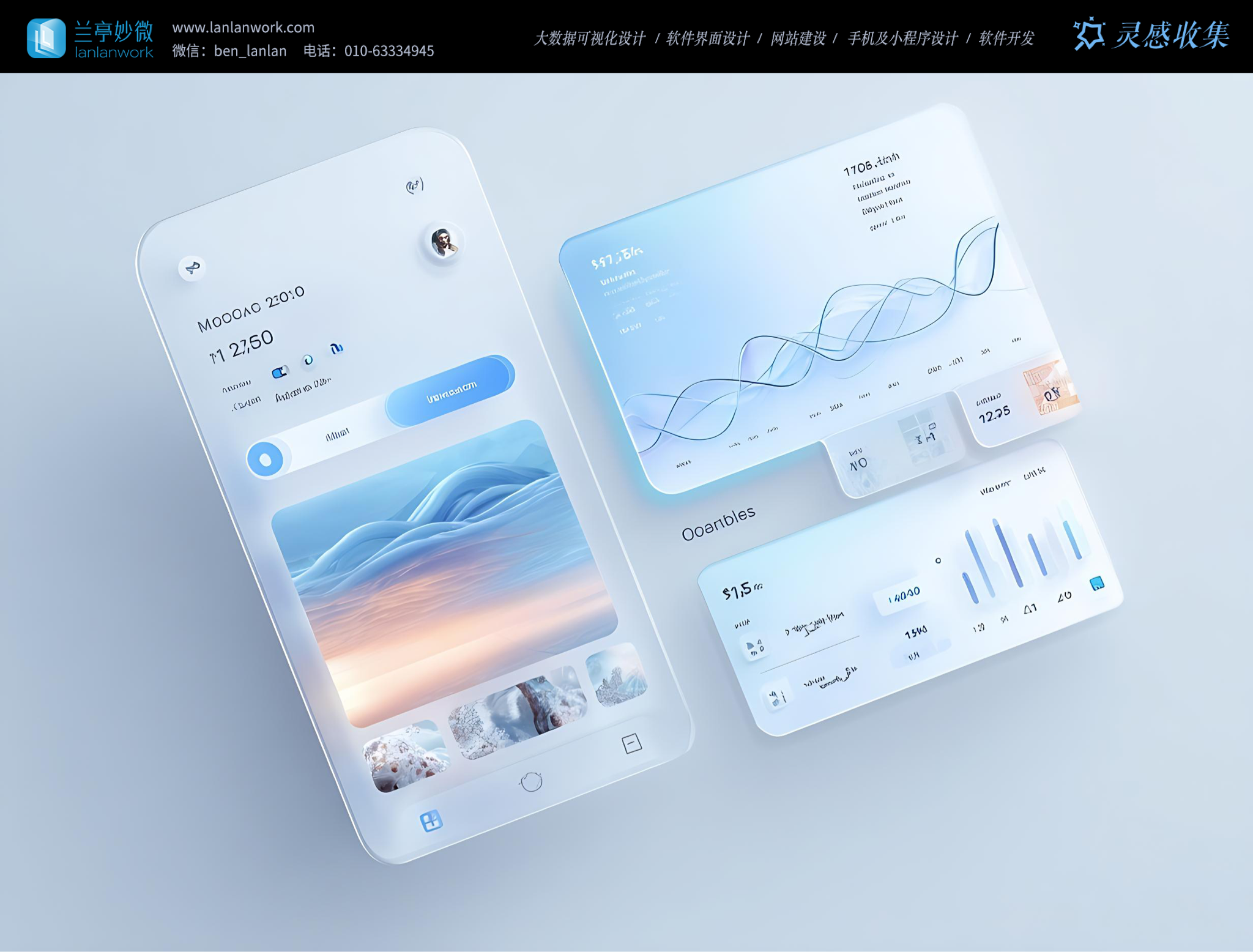 質(zhì)感上大量運用玻璃態(tài)(毛玻璃、透明漸變)和柔滑曲面,界面元素如懸浮卡片、按鈕邊緣呈現(xiàn)細(xì)膩的光影過渡,搭配圓潤的圓角設(shè)計,讓整體風(fēng)格顯得輕盈且富有呼吸感,例如第二張圖中半透明的界面模塊,第四張圖里柔和的卡片邊緣,增強了設(shè)計的精致度與柔和感。